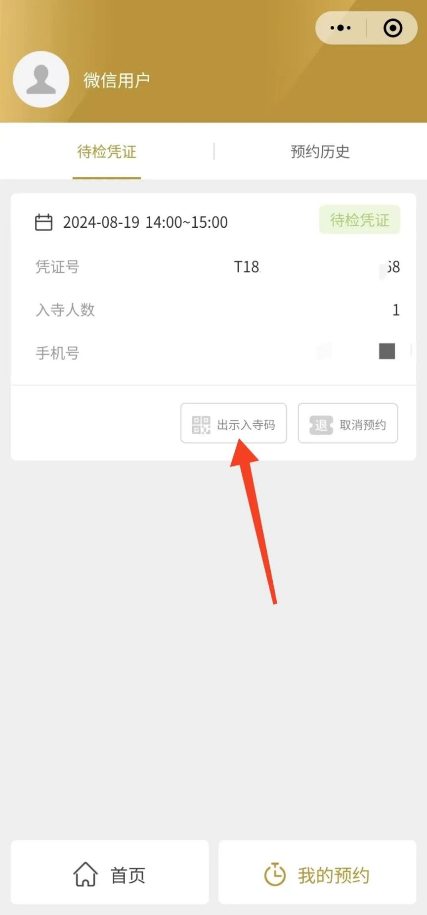 6、进入“我的预约”页面,点击【出示入寺码】即可获取入寺凭证。