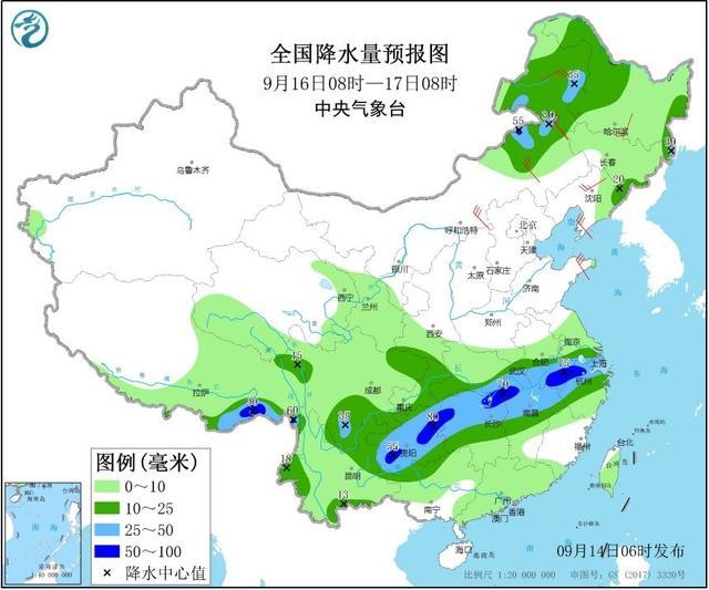 9月14日暂时不是太强,到了9月15日的时候,范围明显扩大,其中9月15日08时至16日08时,在内蒙古东部、辽宁西部、河北东北部、湖南北部、贵州西南部、云南西北部、西藏东南部等7省局地地区将有明显的暴雨,最强降雨量达到了95毫米。